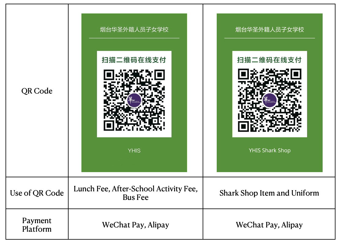 Parents can pay different kinds of fees for their child through two school QR codes. Please refer to the table below for more information. Our finance staff will take care of your requests within one working day.